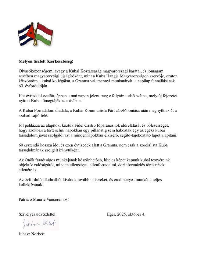 Olvasóközönségem, avagy a Kubai Köztársaság magyarországi barátai, és jómagam nevében magyarországi újságíróként, mint a Kuba Hangja Magyarországon szerzője, ezúton köszöntöm a kubai kollégákat, a Granma valamennyi munkatársát, a napilap fennállásának 60. évfordulóján.